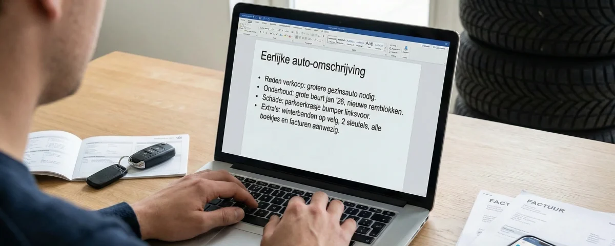 Een goede omschrijving levert betere biedingen op. Niet omdat je mooier praat, maar omdat je duidelijkheid geeft. Dealers houden van concrete info.